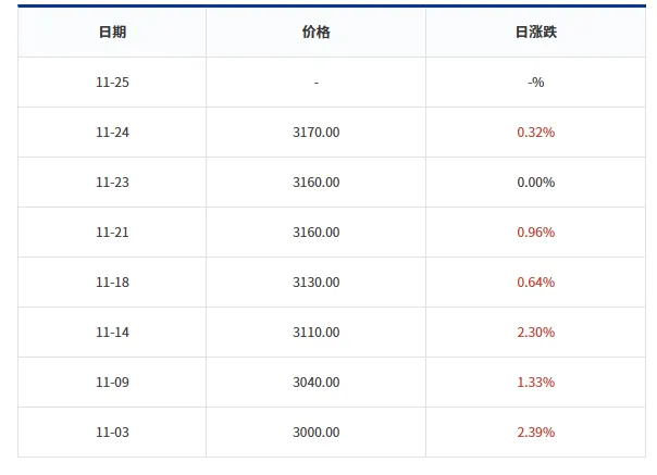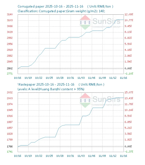 140g/m² நெளி காகிதத்தின் விலைகள் அக்டோபர் 16 முதல் நவம்பர் 16, 2025 வரை 12.09% அதிகரித்தன. நீண்ட கால இடைவெளியில் (ஆகஸ்ட் 27 முதல் நவம்பர் 25 வரை), ஒட்டுமொத்த லாபம் 20.99% ஐ எட்டியது. நவம்பர் 24 இல், சமீபத்திய விலை டன் ஒன்றுக்கு 3170 RMB ஐ எட்டியது, சிறிய மேல்நோக்கி சரிசெய்தல் தொடர்கிறது.